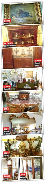 “Piaţa de valori nu mai funcţionează, iar mobilierul vechi nu mai este la căutare. În România nu se vând bine, doar la Paris ar mai avea o şansă printre pasionaţii de astfel de produse. Femeia a cumpărat în necunoştiinţă de cauză. Majoritatea nu depăşesc 2.000 de euro maxim, iar un preţ minim 300 de euro. Candelabrele valorează 1.500-2.000 euro, dormitorul este stil Ludovic XVI-lea şi ajunge la 1.500 euro. Oglinda imensă de pe perete poate ajunge la 700 euro, statuetele 300-700 euro, salonul complet ajunge la 1.500 euro, argintăria - 1 euro gramul, comoda cu ceas 2.000 euro”, spune criticul de artă.
