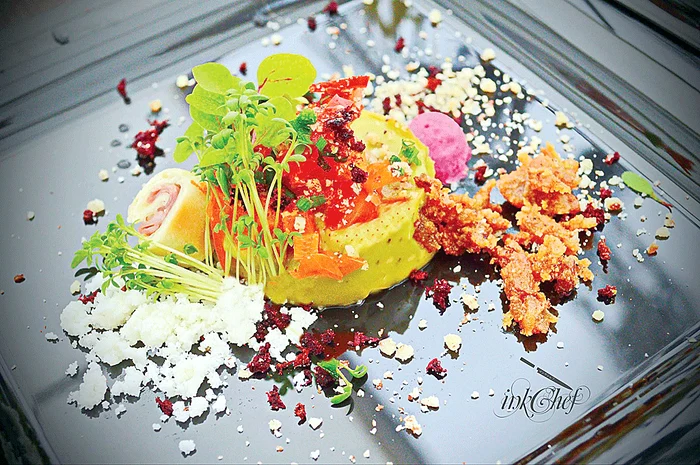 Mod de preparare: şoricul se pune la cuptor şi se lasă până devine crocant, apoi se sfărâmă. Avocado se pasează, se adaugă restul legumelor tocate mărunt şi se continuă pasarea. Sfecla roşie se fierbe, se pasează, se dă prin sită şi se introduce într-un recipient tip sifon, cu smântâna. Se combină aluatul cu prosciuto şi caşcavalul, se fac spirale care se dau la cuptor, apoi se taie în rulouri. Pe farfurie se pune pasta de avocado într-o formă rotundă, se decorează cu bucăţele de roşii şi ardei tocate mărunt, cu vlăstari, alături se pune cranţul de şoric, rulourile de prosciuto şi spuma de sfeclă. Paul a mai făcut un cranţ din sfeclă roşie, crutoane de pâine aromatizată şi un praf din ulei de nucă, după reţete numai de el ştiute.