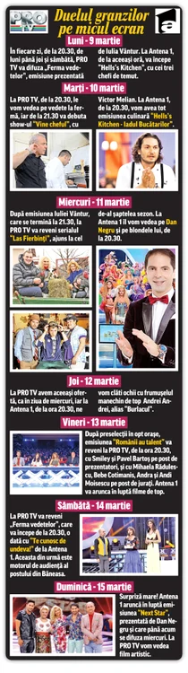 Bătălie mare va fi şi în weekend între Antena 1 şi PRO TV. Dacă postul din Băneasa are un motor de audienţă pentru sâmbătă, şi anume show-ul “Te cunosc de undeva”, cei din Pache Protopopescu mizează vineri pe “Românii au talent”, emisiune care va reveni din 13 martie. Cu aşa cantitate de divertisment, rămâne de văzut cum se vor împărţi punctele de rating, fanii şi banii din contractele de publicitate.