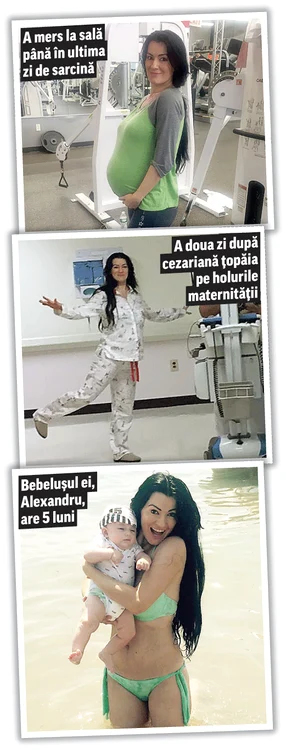 A lucrat ca trainer până în luna a şasea, dar a continuat să facă sport pe cont propriu. Zilnic făcea exerciţii cardio şi urca pe bandă echivalentul a 43 de etaje. „Am mers la sală până în ultima zi dinaintea operaţiei de cezariană. N-am avut nicio problemă, m-am îngrăşat doar 13 kg, în condiţiile în care eu nu ţin niciodată diete şi sunt o mâncăcioasă. Kilogramele în plus le-am dat jos gradual. La o lună de la naştere eram ca înainte, doar cu ceva burtică. Nu am rămas nici cu celulită, nici cu vergeturi, pentru că toată sarcina am turnat ulei de cocos şi de măsline pe mine de lăsam dâre din baie până în dormitor”, povesteşte artista.