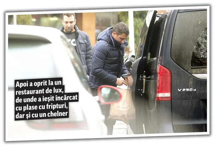 Pentru început a mers la o farmacie, de unde a ieşit cu o plasă de medicamente, apoi s-a dus în Piaţa Floreasca să cumpere mere, banane şi rodii. Următoarea oprire a fost la un restaurant de fiţe din aceeaşi zonă, de unde a ieşit burduşit cu plase cu fripturi.
