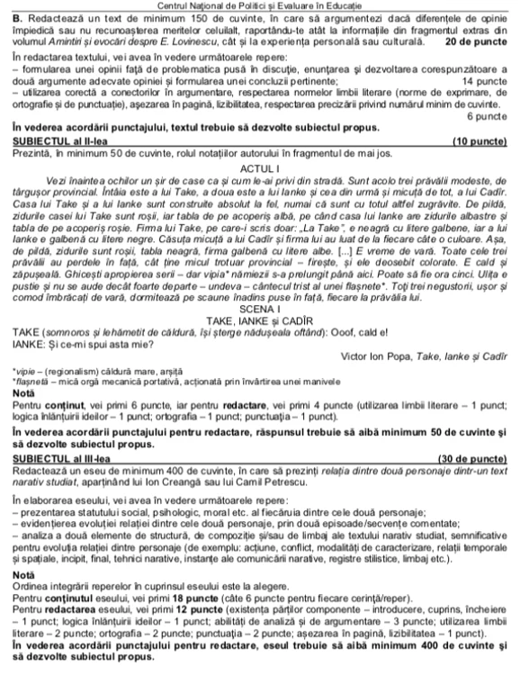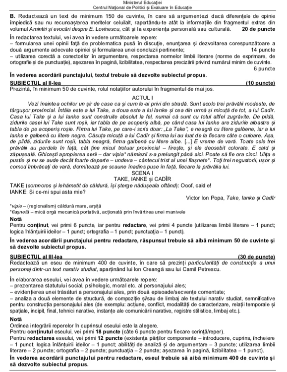 Subiectul I conține un fragment la prima vedere, iar cerințele de la punctul A verifică în ce măsură elevul a înțeles despre ce este vorba în text. La punctul B, elevului i se cere să redacteze un text argumentativ propriu, de minimum 150 de cuvinte, în care să-și susțină punctul de vedere legat în general de o anumită idee prezentă în textul dat.