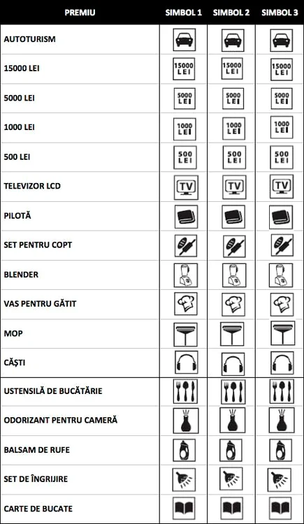 Exemple: pentru a câștiga premiul constând în mașină, pe loz trebuie să apară 3 simboluri cu mașină. Pentru a câștiga suma de 5.000 de lei, pe loz trebuie să apară de 3 ori simbolul 5.000 LEI.