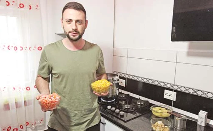 Îşi ia reţetele de pe internet, le adaptează în funcţie de imaginaţie şi de ce are în frigider, iar pe mama o mai sună doar pentru chestii „de fineţe”. Face acum de la salate şi grătare până la tocăniţe, supe şi ciorbe cu borş. Preferata lui e supa cremă de porumb. „O fac de cel puţin două ori pe lună. Porumbul are o mulţime de proprietăţi şi e indicat sportivilor pentru cantitatea mare de proteine pe care o conţine. Mie îmi place porumbul în toate formele, iar la mine în cămară veţi găsi mereu cel puţin 10 conserve”, ne spune, în timp ce se apucă să pregătească legumele. A tăiat şi pus la fiert câţiva cartofi, apoi a adăugat morcovi, ciuperci, ceapă, iar după circa 20 de minute a adăugat două conserve mari de porumb, scurs de apă. A condimentat cu sare şi piper după gust, iar farfuria a ornat-o cu smântână. Rezultatul – un deliciu.